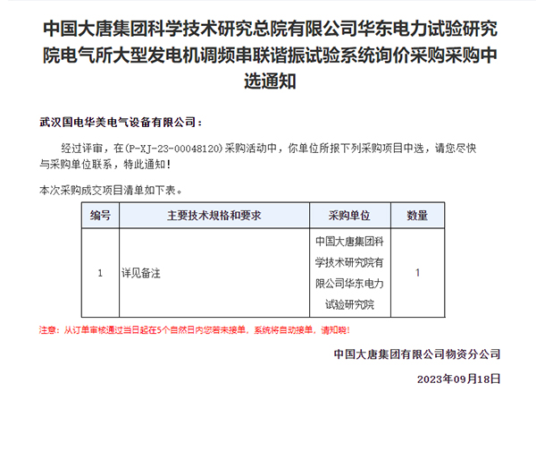 喜讯:国电华美成功中标中国大唐集团大型发电机调频串联谐振试验系统项目